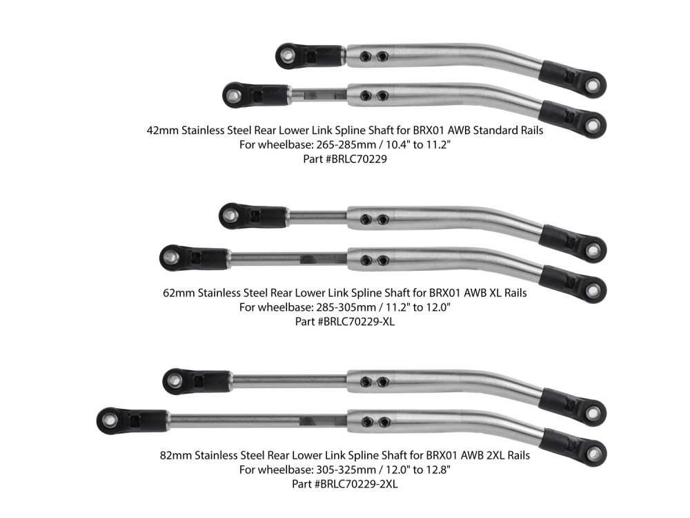 หากต้องการตั้ง Wheelbase ที่ 313 มม. (12.3″) แนะนำให้ใช้ลิงก์ล่างหลังชุดนี้ร่วมกับ เพลาขนาด 82 มม. (2XL)
